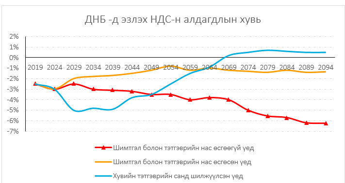Харин хувийн тэтгэврийн сан руу шилжүүлбэл богино хугацаанд ДНБ-н алдагдал 5 хувь хүрэх ч 2069 оноос эхлэн ашигтай гарч ирж байна(цэнхэр зураас). Мэдээж бид шууд НДШ-ийг хувийн сан руу шилжүүлж чадахгүй учир бусад улс орнуудын адил НДШ-ийн 1 хувь, 2 хувийг шилжүүлэх байдлаар явах нь зүйтэй.